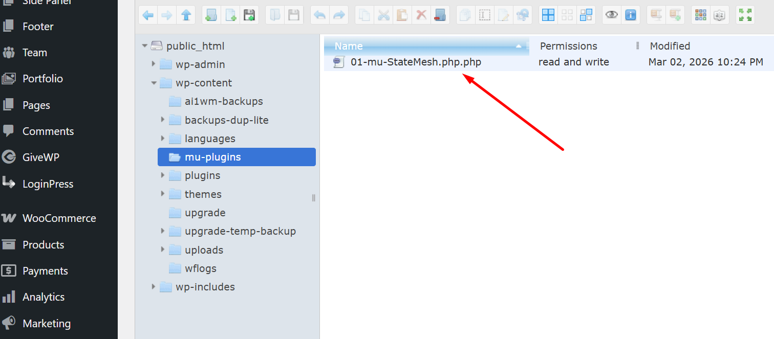 The file 01-mu-StateMesh.php.php was discovered in the wp-content/mu-plugins directory, suggesting it was executed as an MU (must-use) plugin.